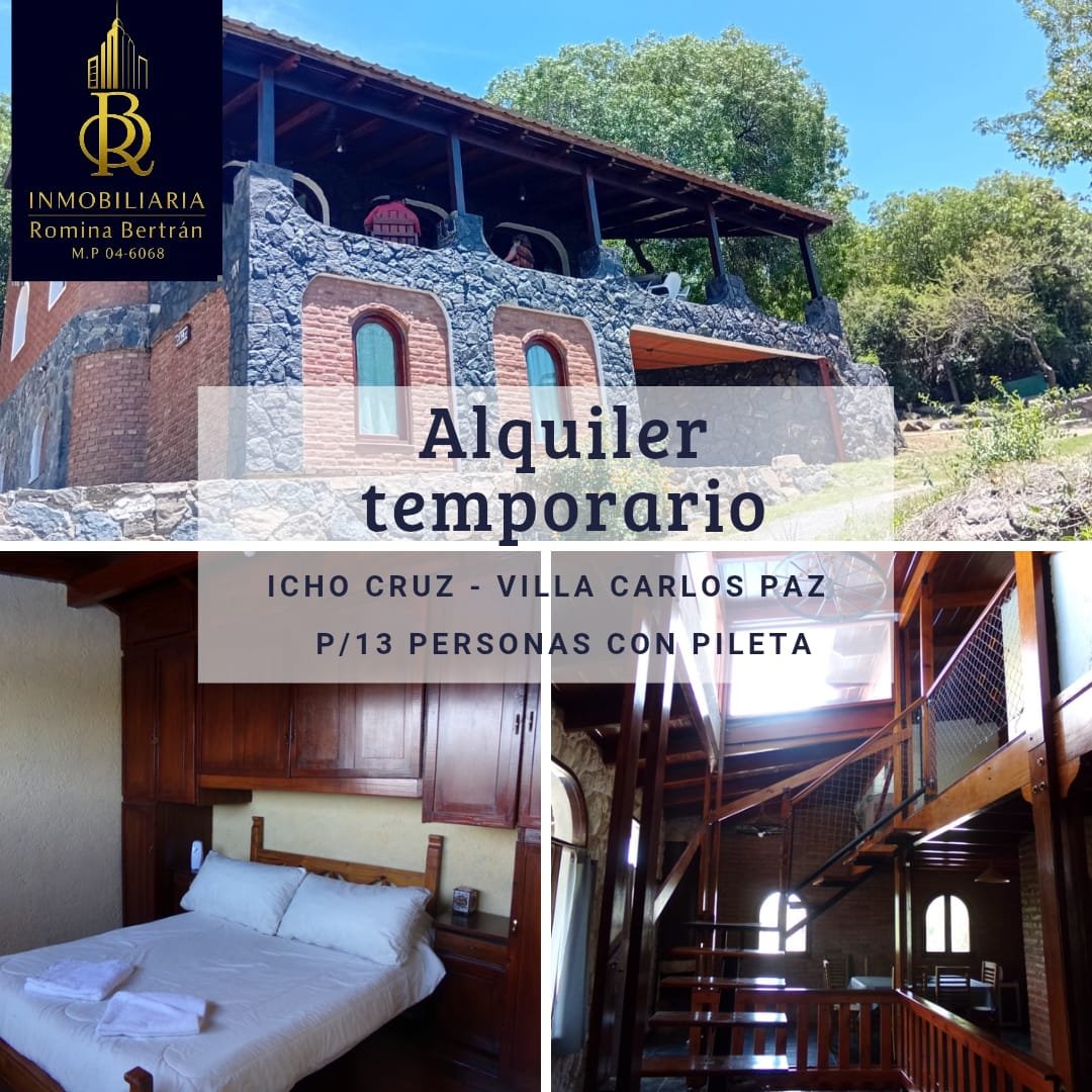 Casa en Icho Cruz: el plan ideal para disfrutar en grupo. Con capacidad para 13 personas, esta casa amoblada combina comodidad y naturaleza en un entorno soñado. Distribución práctica: en planta alta, 2 dormitorios y un baño con una gran vista a las sierras 🌄. En planta baja, 3 dormitorios y otro baño, perfecta para familias y grupos numerosos 👨👩👧👦. La cocina comedor está equipada con heladera, cocina y microondas 🍳🧊, lista para tus reuniones y comidas sin complicaciones. Además, cuenta con una amplia galería para relajarte al aire libre 🌿. El parque se luce con una pileta ideal para los días de sol 🏊♂️ y espacio de sobra en un terreno de 1000 m², para disfrutar sin apuros. WiFi para estar siempre conectados 📶 y TV por cable con pack fútbol incluido ⚽, para no perderte ningún partido. Estacionamiento disponible 🚗. A 15 minutos de Carlos Paz y a dos cuadras del rio. - Para grupos hasta 4 personas, el precio es de $80.000 por día (4 días o mas $75.000 por día) - Para grupos de 5 hasta 8 personas , el precio es de $140.000 por día (4 días o mas $120.000 por día) - Para grupos de 9 hasta 13 personas , el precio es de $200.000 por día (4 días o mas $175.000 por día) Estadía mínima 3 días. Una opción completa para vacaciones, escapadas o encuentros especiales en Icho Cruz. Consúltanos para coordinar tu visita y enamorarte de este lugar.