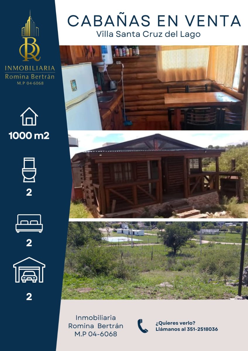 Cabañas Estancia Vieja – Oportunidad para invertir y disfrutar en Villa Santa Cruz del Lago Se venden 2 cabañas de tronco amobladas, ideales para renta turística o escapadas propias en un entorno natural único 🌿. Cada unidad cuenta con: - 1 dormitorio matrimonial 🛏️ - 1 baño 🚿 - Cochera con media sombra 🚗 - Ambiente living-comedor-cocina 🍽️ Equipamiento: - Habitación con cama matrimonial, televisor y ventilador de pared 📺🌀 - Cocina con mesa y 4 sillas, alacena y bajo mesada, anafe y horno eléctricos, heladera y termotanque eléctrico 🔌🍳 - Cama marinera de una plaza en área común 🛌 - Ventilador de pared adicional 🌀 Terreno de 1000 m², ideal para seguir desarrollando o disfrutar del espacio al aire libre 🌳. Propiedad amoblada ✅, estacionamiento ✅, apta para mascotas 🐾 y con opción de permuta 🔁. Excelente alternativa para quienes buscan rentabilidad sostenida con alquileres temporarios en un destino turístico en crecimiento 📈. Consultanos por condiciones, formas de pago y más info. Escuchamos ofertas